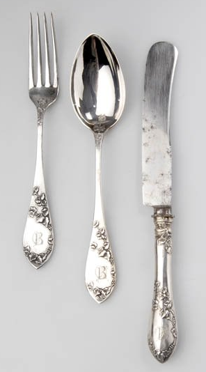 Silber. Tafelmesser (Stahlklinge): 27cm; Menügabel: 21.3cm; Suppenlöffel: 22cm. |