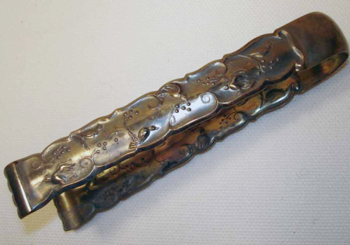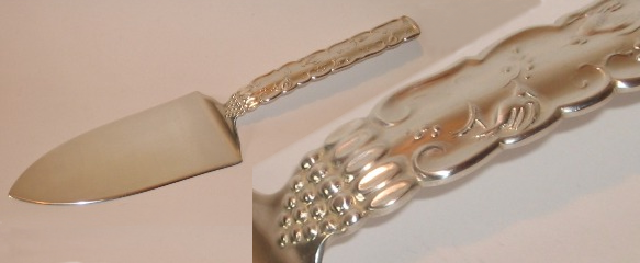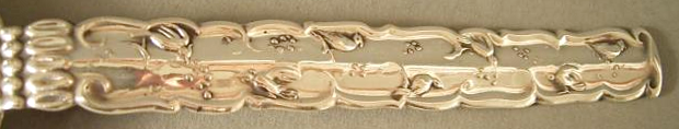 Reliefdekor aus Vögeln, Blüten und Rankenwerk. Die Form dem Stil der Neuen Sachlichkeit zuzuordnen. Mit dem gleichen Dekor waren auch Tortenheber, Zierlöffel sowie eine Zuckerzange lieferbar. Nach 1945 auch als Stabbrosche erhältlich.