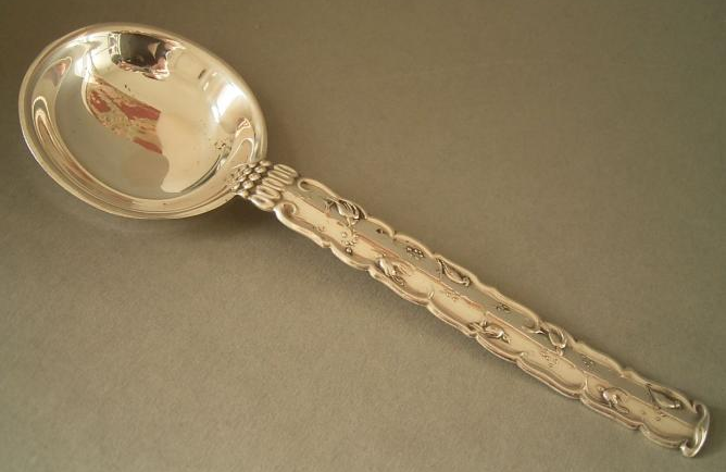 800er Silber. Länge: 20cm. Runde Laffe mit außem gekehltem Rand, reliefierter Stiel mit traubenartigem Anstoß, godronenartig gewelltem Rand, im Spiegel Vögel zwischen Ästen mit Fruchtdolden. |