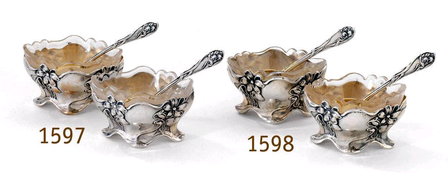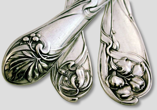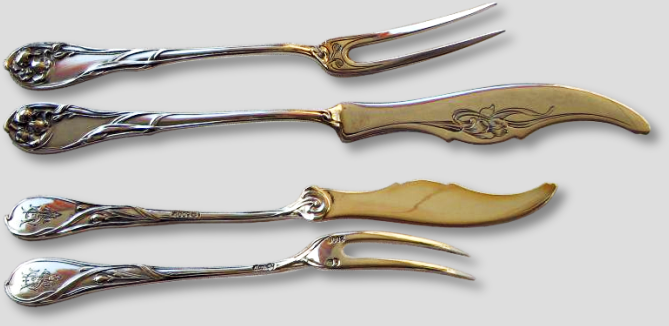 Cutlery for the World Exposition, Paris 1900. Silver, partially gilded. Relief decor with lilienblutigen flowers. Knife blades with ziseliertem leaf tendril pattern. Each type of cutlery has a different, asymmetrical floral ornament.