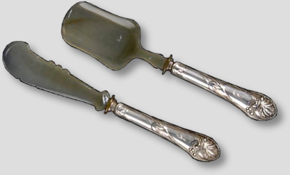 Pastetenlöffel & Käsemesser 800er Silber. Pastetenlöffel: 19cm; Käsemesser: 19.50cm. Mit spatenförmiger Laffe und geschweifter Klinge bzw. aus Horn. |