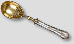 800er Silber. Länge 16.20cm. Mit floral durchbrochen gearbeiteter Laffe. Kellen aus vergoldetem Metall, graviert, ziseliert. |