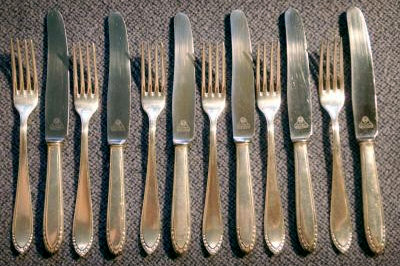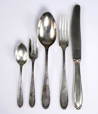 100er Silber. Länge: ~15.20cm. Messer, Gabeln, Speiselöffel, Kuchengabeln, Kaffeelöffel. |