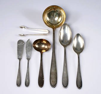 100er Silber. Teelöffel, Mokkalöffel, Ladle, Sauce ladle, Butter & Käse messer, Zucker Tongs. |