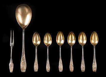 Silber, Kellen vergoldet. Serviergabel: 12cm; Servierlöffel: 19cm; Mochalöffeln: 11.20cm bzw. 19 cm. |