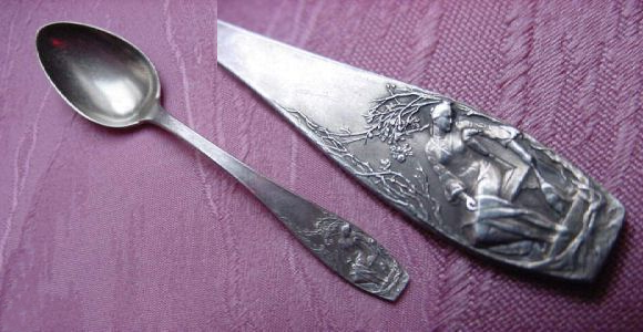 Shield-shaped flat handles with relief representation of different fairytale scenes. Serving fork handle has a relief representation of the Nibelungen scene "Wotan's Parting". Back and wing belt ornamentation.